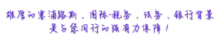 ? ? ? ?北京創睿友邦商務咨詢有限公司團隊主要負責人曾在塞浦路斯本國學習、工作十幾年,是英國特許公認會計師協會會員(ACCA/FCCA),曾就職于塞浦路斯畢馬威審計和稅務籌劃部門、塞浦路斯銀行等大型專業服務機構。團隊具有專業的國際財會知識和豐富的服務經,了解塞浦路斯及歐盟稅收體系,熟知國際會計準則和操作要領。為中國外貿、跨境投資、跨境電商等企業提供專業、個性化的稅務籌劃、可行性分析和合規指導。我們與塞浦路斯當地銀行一直以來保持戰略合作關系,能為中國客戶協助遠程辦理當地銀行的各項事務,讓您足不出戶便能享受專業的國際銀行服務。